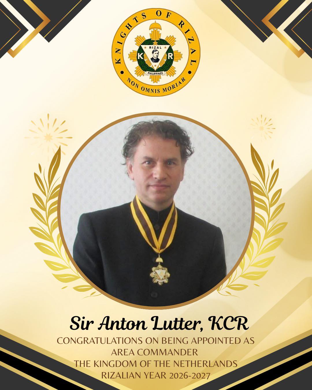 The Supreme Council has confirmed the appointment of Sir Anton Lutter, KCR, as Area Commander for the Kingdom of the Netherlands for Rizalian Year 2026–2027.