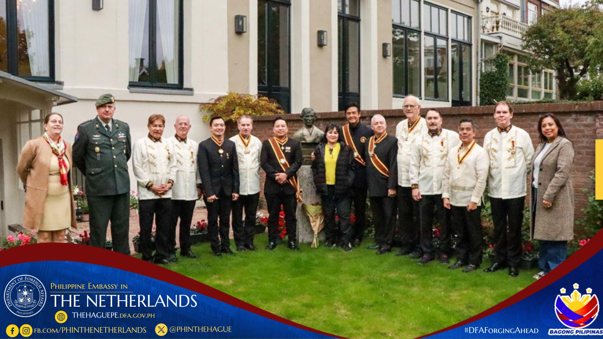 Sir Raymundo del Rosario, KGCR, Supreme Commander of the Order of the Knights of Rizal (KOR), conducted a flower-offering ceremony on 11 October at the Rizal Courtyard of the Philippine Embassy, together with the members of the KOR Chapters of The Hague, Rotterdam, Amsterdam, and Utrecht, and other KOR officials from Belgium.